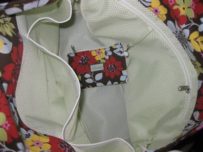 I received the Garden Style Tote Bag. It is a great sized bag that in my opinion is the perfect beach, boat, or park bag! The material is a nice thick canvas that you can tell is very durable! The handles are attractive with the silver rings and rests comfortably on your arm. It has a zippered pocket inside along with 3 open pockets. It also comes with a small little matching pouch that attaches with a clip and is the perfect size for keeping things like your license, money, and keys in.