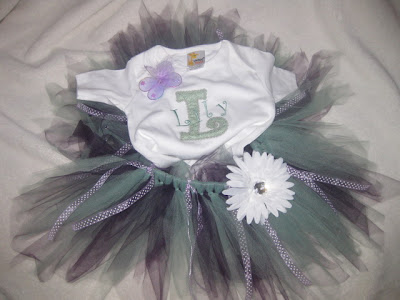 I had the opportunity to review one her simply adorable tutu sets. I chose the Curlz Applique Onesie and Tutu Set. She asked me what colors I liked and what name I’d like to have on it. All I told her was plum and sage with the name Lily. This is the stunning work I received:The only problem stitcheroos will have is the day I have my own little girl to spoil Adrienne won’t have enough tulle on hand to keep up with my orders!