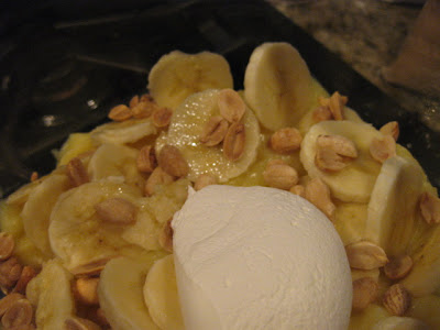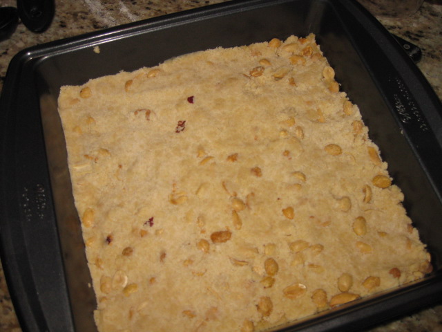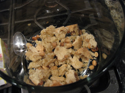 First take the flour and brown sugar in a large bowl. Cut in the butter using a pastry cutter. If you don’t have a pastry cutter use two butter knives cutting against each other like I did. Do this until the mixture is crumbly. Stir in peanuts.