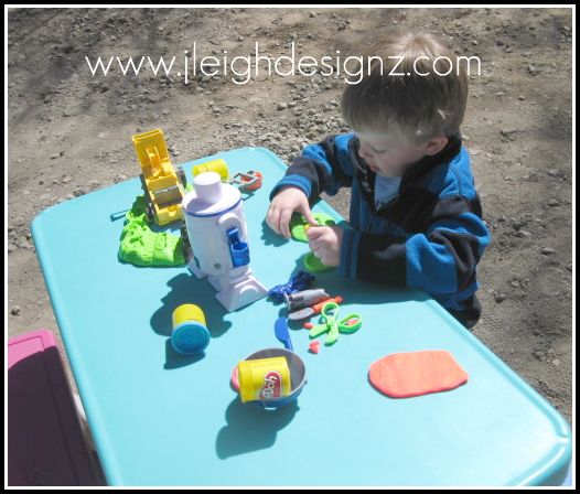 Do you have one of these plastic picnic tables? I got this Fisher Price one at a tag sale about 5 years ago for $5. Best $5 I’ve spent! It’s great for things like this and finger painting. Plus, the kids eat at it when we use the grill.