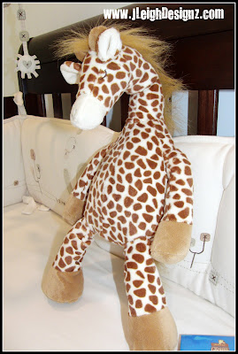 I love the sound options that they chose for play, calm, relax, and sleep. You can see a pictured image above. It also has a timer option if you push it to the left or right. Chose from no timer (middle), 23 minutes (left), and 45 minutes (right). Images and me telling you don’t do much with a sound machine so I wanted to show you here:Not to mention after all the great things this Gentle Giraffe is adorable in your nursery setting! Look how cute it looks with my sleepy safari bedding set. I love the glimmer its pretty fur too! With its velcro straps I can securely attach it to this crib and up away from baby!