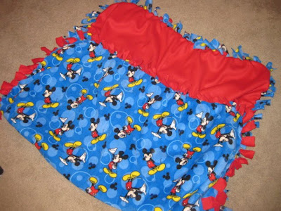 For the past few years I have given Fleece Tied Blankets as gifts. They have been a huge hit and now people have actually asked for them. Gavin had a little monkey one I made him when he was around 6 months old that is too small now. It is however, the perfect size for a stroller blanket!