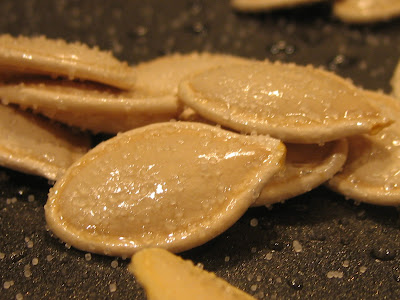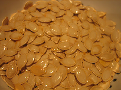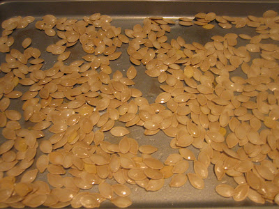 I also love fresh roasted pumkin seeds and thought you like to know that you can take them directly from rinsing to the baking sheet and into the oven! No waiting to day, no oil.